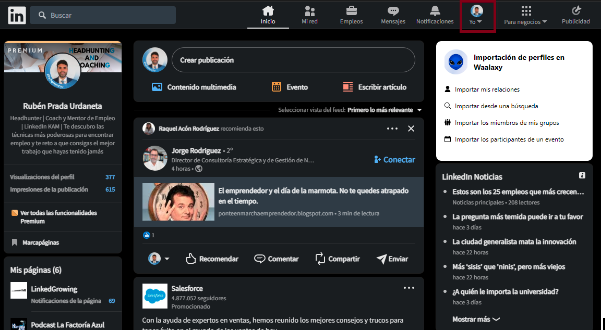 - Haz clic en el icono de Yo, en la parte superior de la página de inicio de LinkedIn.