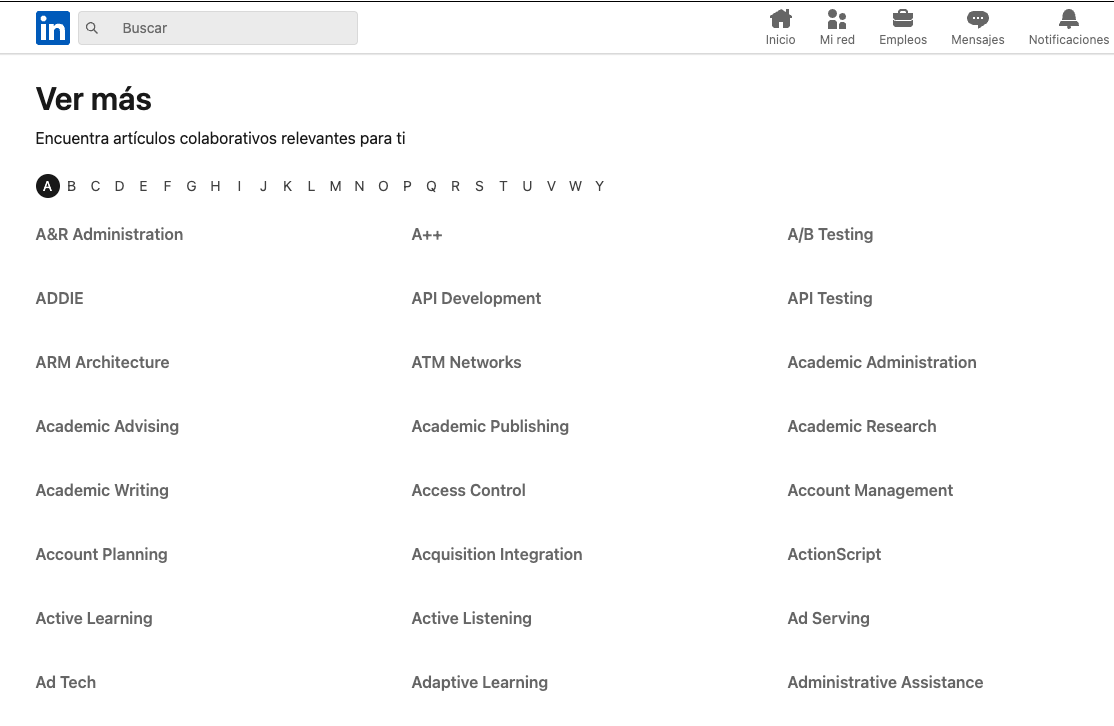 Para haceros una idea de la ingente cantidad de artículos colaborativos que se pueden generar, leer y/o interactuar, tenemos que irnos hasta este link: https://www.linkedin.com/pulse/topics/home/ Los artículos están clasificados en muchísimas categorías e incluso podemos buscarlos por orden alfabético de las que nos interesen: