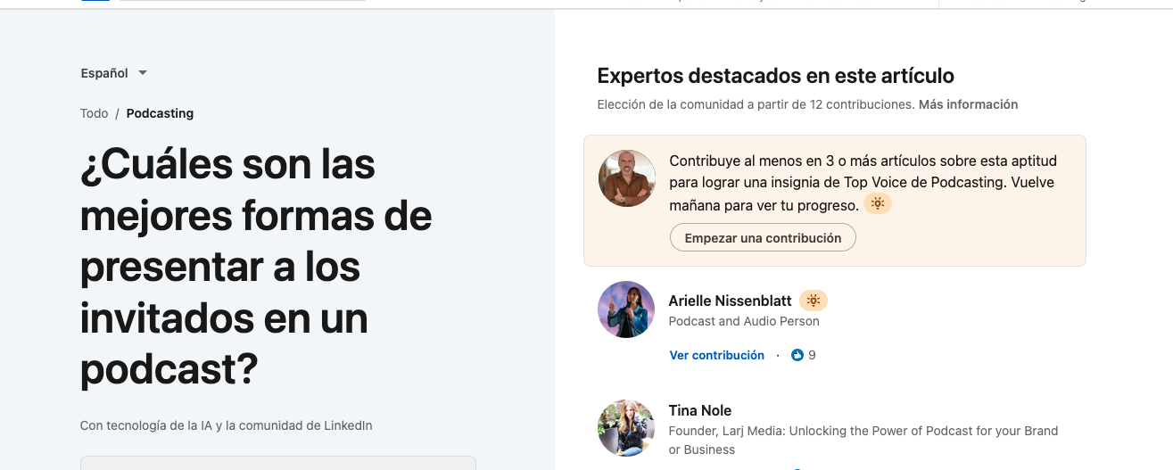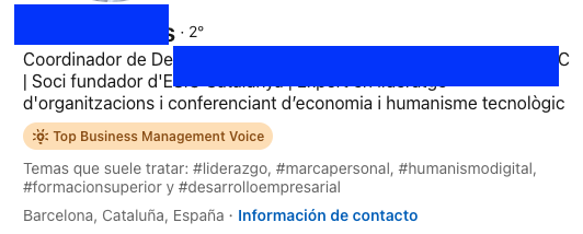 Pues la participación continua sería lo que decimos de carrera de fondo. Esto es porque toda esta participación también podrá tener su reconocimiento. Y es que LinkedIn «premiará» las aportaciones con insignias de Community Top Voice (por ejemplo, «Top Business Management Voice») si se consigue ser uno de los contribuidores con más recomendaciones o reacciones y los miembros consideran que las contribuciones aportadas son de las más interesantes en los artículos colaborativos de una aptitud concreta.